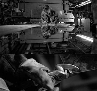 Die zur Frontgestaltung verwendeten Rohbleche müssen zunächst auf Maß zugeschnitten werden, um sie anschließend anreißen, ausschneiden und an der Abkantpresse zur Schale formen zu können.