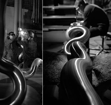 Zwei Arbeitstage sind nötig, damit aus 10-15 Rohrbögen eine künstlerische Plastik wächst. Anhand der Musterform werden die Segmente ausgerichtet und auf dem Sockel nach oben hin aufstrebend zusammengeheftet. Anschließend erfolgt das Dichtschweißen, um nach dem Entfernen der Schweißnähte gleichmäßig längsgeschliffen, gereinigt und mit einem die Heizleistung optimierenden Klarlack veredelt zu werden. |